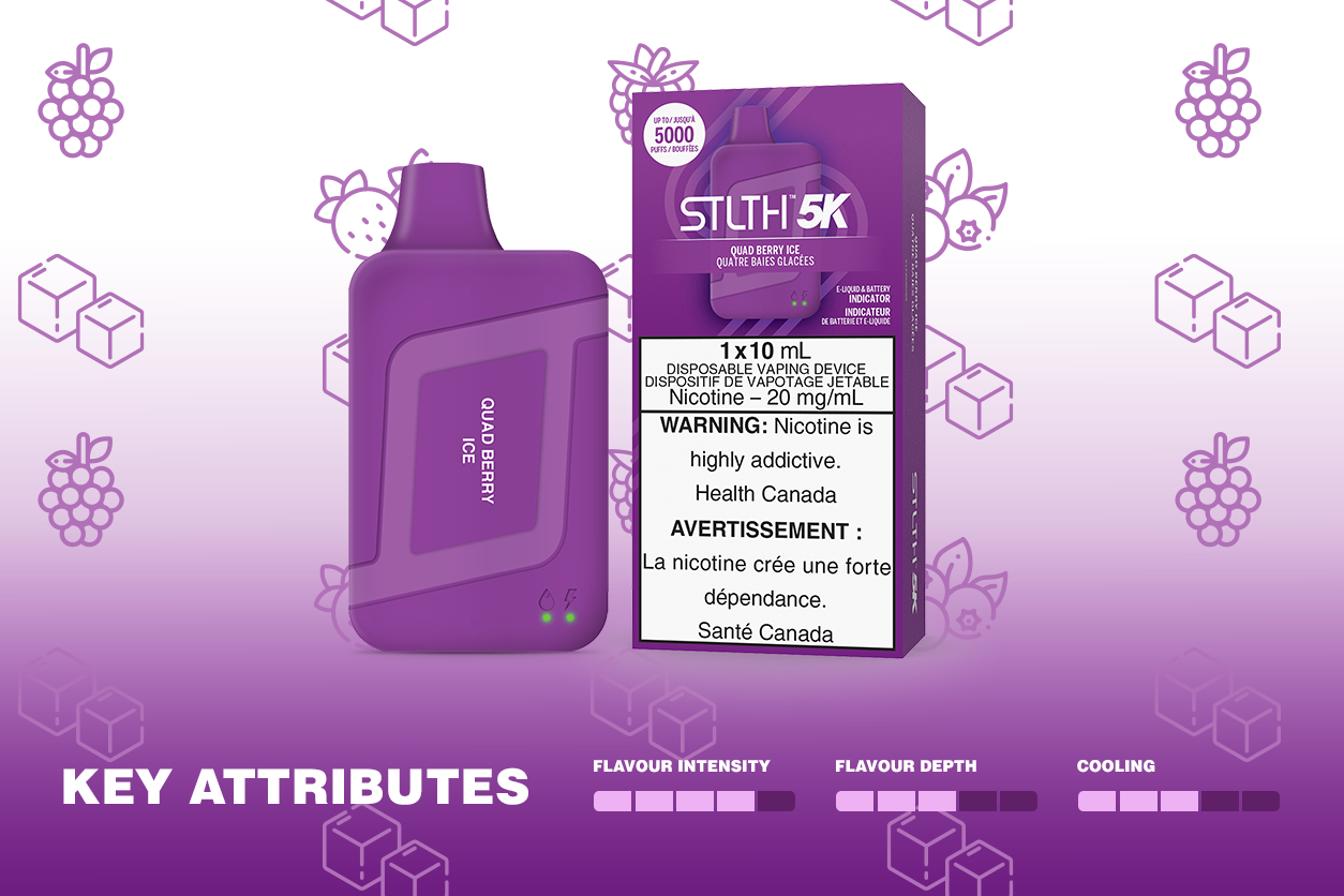 STLTH 5K Disposable, Quad Berry Ice is a blend where ripe strawberries, tangy blueberries, zesty raspberries, and rich blackberries intertwine, all heightened by a refreshing icy note. This flavour captures the essence of mixed berries in a crisp and refreshing ensemble.